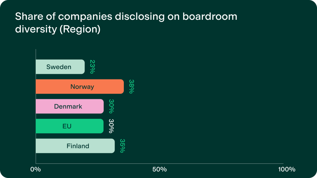 This remains an area of relative strength for the Nordics, but the data suggests that this advantage is neither uniform nor uncontested. Strong performance in certain countries and sectors coexists with weaker results elsewhere, while peer regions increasingly match or exceed Nordic averages. This points to governance diversity as an area where leadership must be actively maintained rather than assumed.