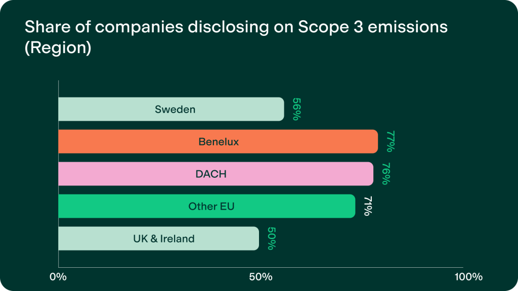 That being said, this is a clear area where the Nordics are not leading. Despite 56% of companies in this region reporting on Scope 3 data, they are far behind Benelux, DACH, and other EU countries, with 77% of Benelux companies reporting on this data. The only region that lags behind the Nordics is the UK & Ireland, with 50% of companies there reporting their Scope 3 data.